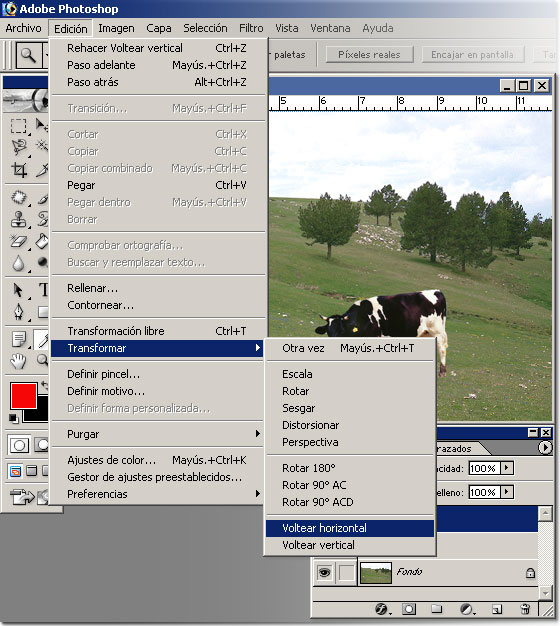 Ahora seleccionamos la capa 2. Vamos a Edición > Transformar