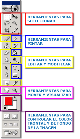 Si miramos la “caja de herramientas” vemos que tiene diferentes botones e iconos, fáciles de reconocer, por las diferentes funciones que podemos realizar: seleccionar, pintar, modificar, visualizar imágenes, etc.