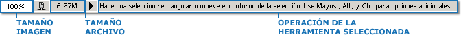 Nos ofrece información sobre el tamaño (el % por ciento) de la imagen en la que estamos trabajando, del tamaño del archivo y sobre la operación que estamos realizando sobre la herramienta seleccionada.