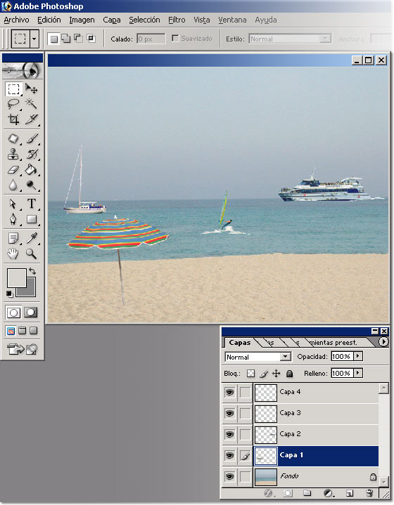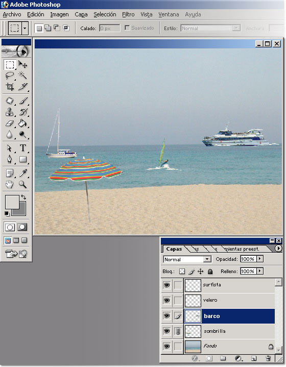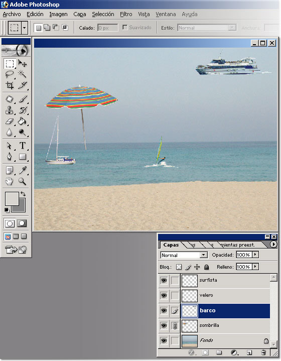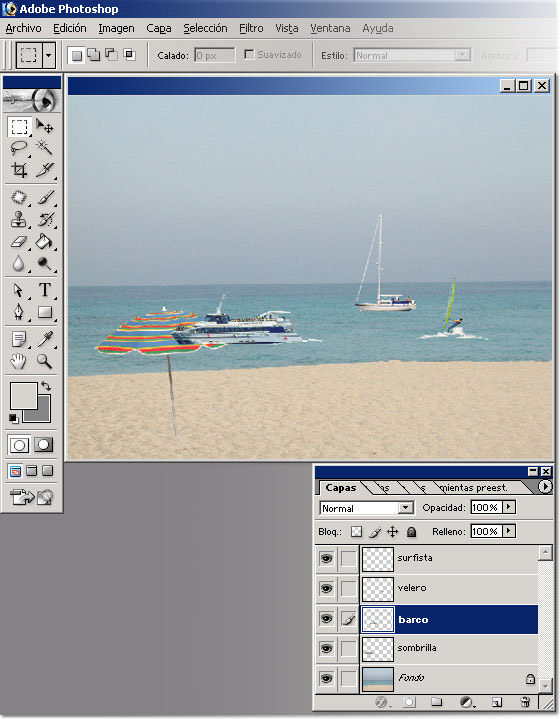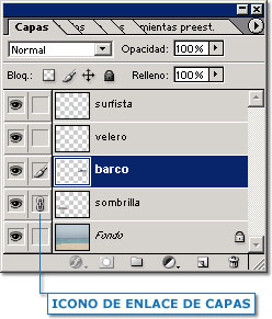 En la siguiente imagen lo que hemos hecho es enlazar las capas "barco" y "sombrilla" para